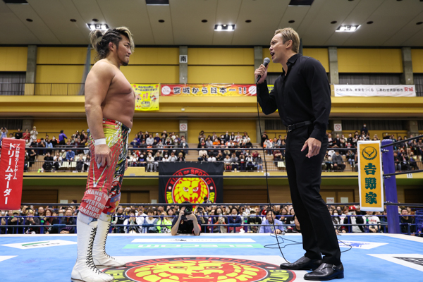 ひさびさに棚橋の眼前に立ったオカダはマイクを握ると、「棚橋さん、引退おめでとうございます!そして、お疲れさまでした。2026年1月4日、よかったら僕がやりますよ。それまで疲れんじゃねえぞ、このヤロー!」と、2012年の1.4東京ドームの凱旋帰国時に、当時IWGPヘビー級王者だった棚橋に宣戦布告したセリフを引用し、現役最後の相手として名乗りを上げた。